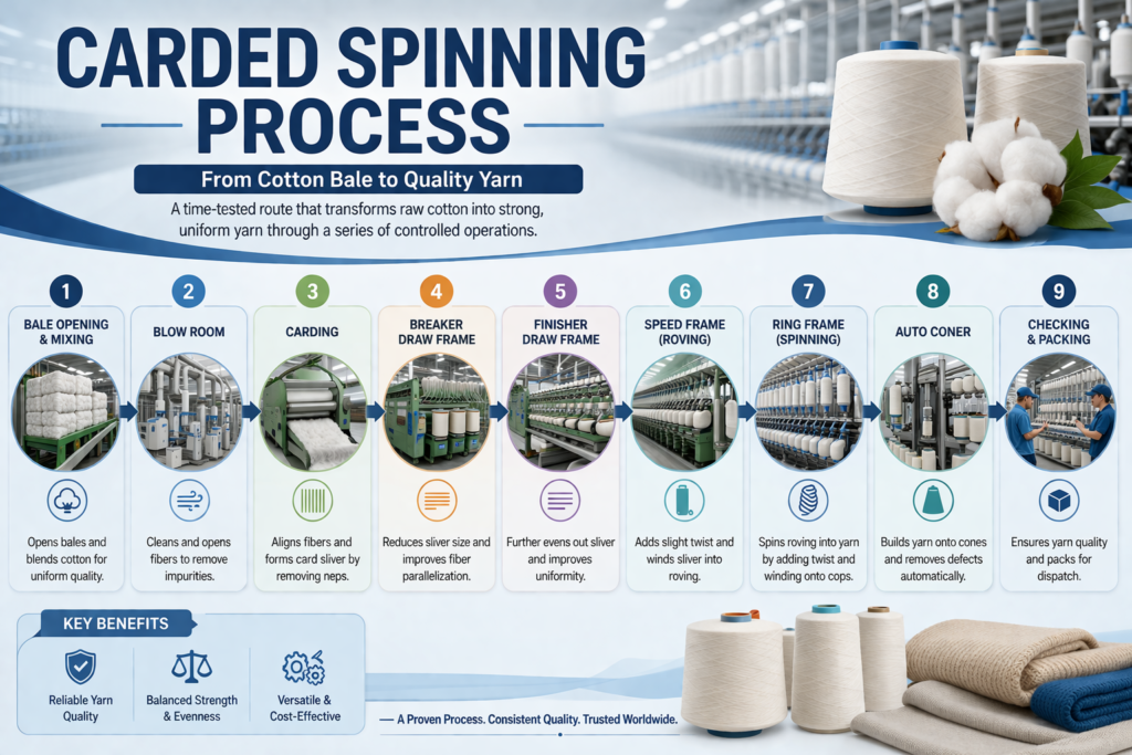 The carded yarn process is the most basic and widely used spinning route. It involves fewer steps compared to combed yarn manufacturing.