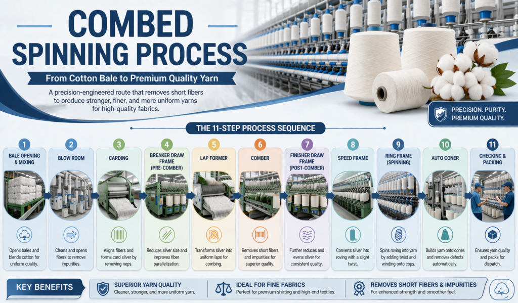 - Combed Yarn Process: Incorporates additional quality-enhancing steps, passing through a lap former and comber before reaching the finisher draw frame.