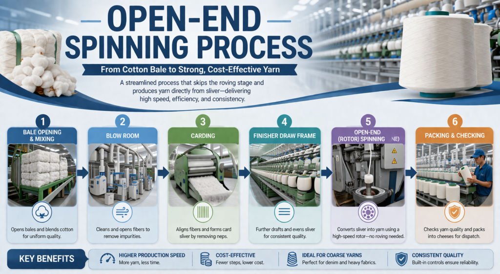 - Open-End Yarn Process: Offers a shorter route by skipping the roving stage entirely, transitioning directly from the finisher draw frame to open-end rotor spinning.